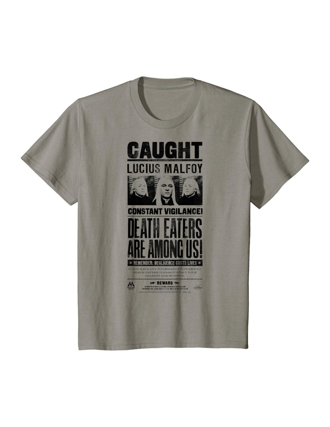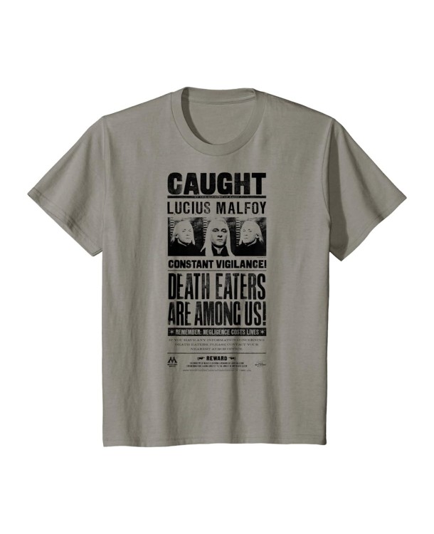 Esta camiseta tiene todo lo que un fan de los villanos de Harry Potter puede desear. Es una camiseta de color gris claro, de manga corta, de cuello redondo y de estilo casual. Está hecha con algodón, un material natural, suave, transpirable y duradero. Tiene la imagen de Lucius Malfoy estampada en el pecho, con su pelo rubio, su mirada fría. Tiene también el lema “Caught” en letras negras, que hace referencia a cuando fue capturado por los aurores en el Ministerio de Magia. Está disponible en varias tallas, desde la S hasta la XXL, para que elijas la que mejor te quede. Es una camiseta diseñada para los fans de Harry Potter y de los villanos de la saga, que quieran expresar su personalidad y su afición por este mundo mágico. Es una camiseta con un precio de risa, que te hará reír tanto como las ocurrencias de Peeves el poltergeist.