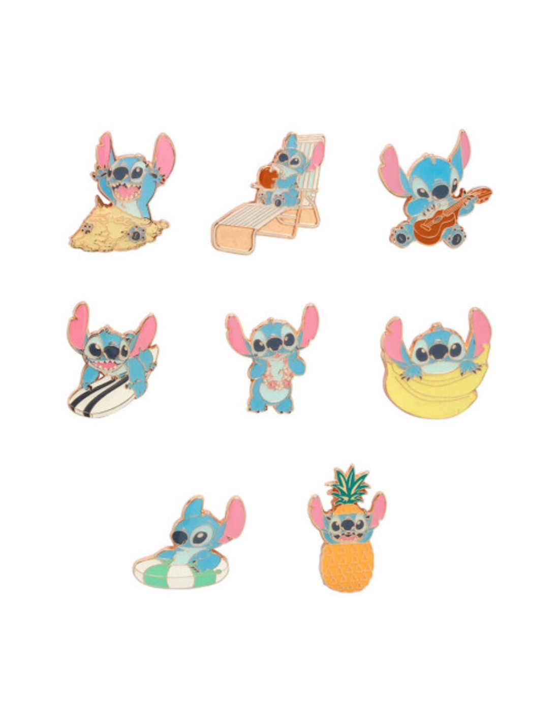 A pesar de su pequeño tamaño, estas chapas están meticulosamente diseñadas para capturar los detalles característicos de Stitch en su versión de verano. Su color, sus gafas de sol y su actitud despreocupada están perfectamente representados.