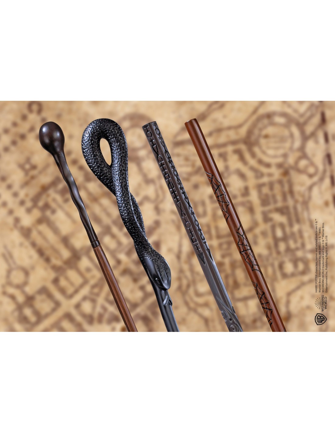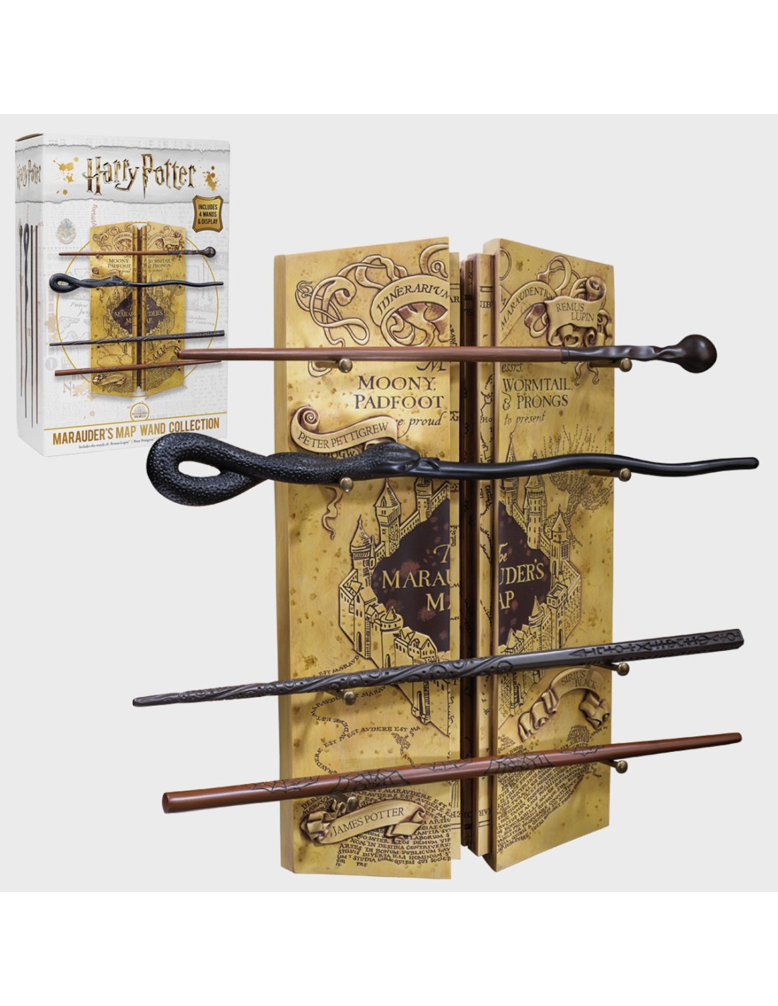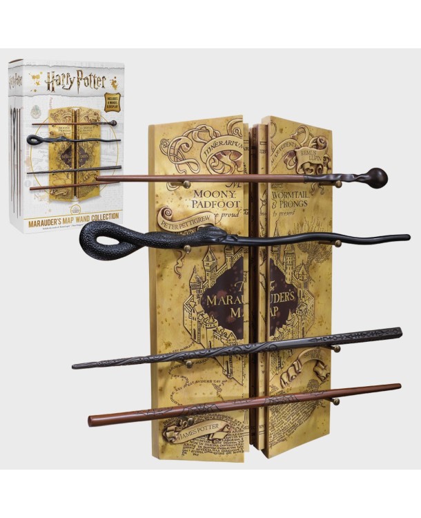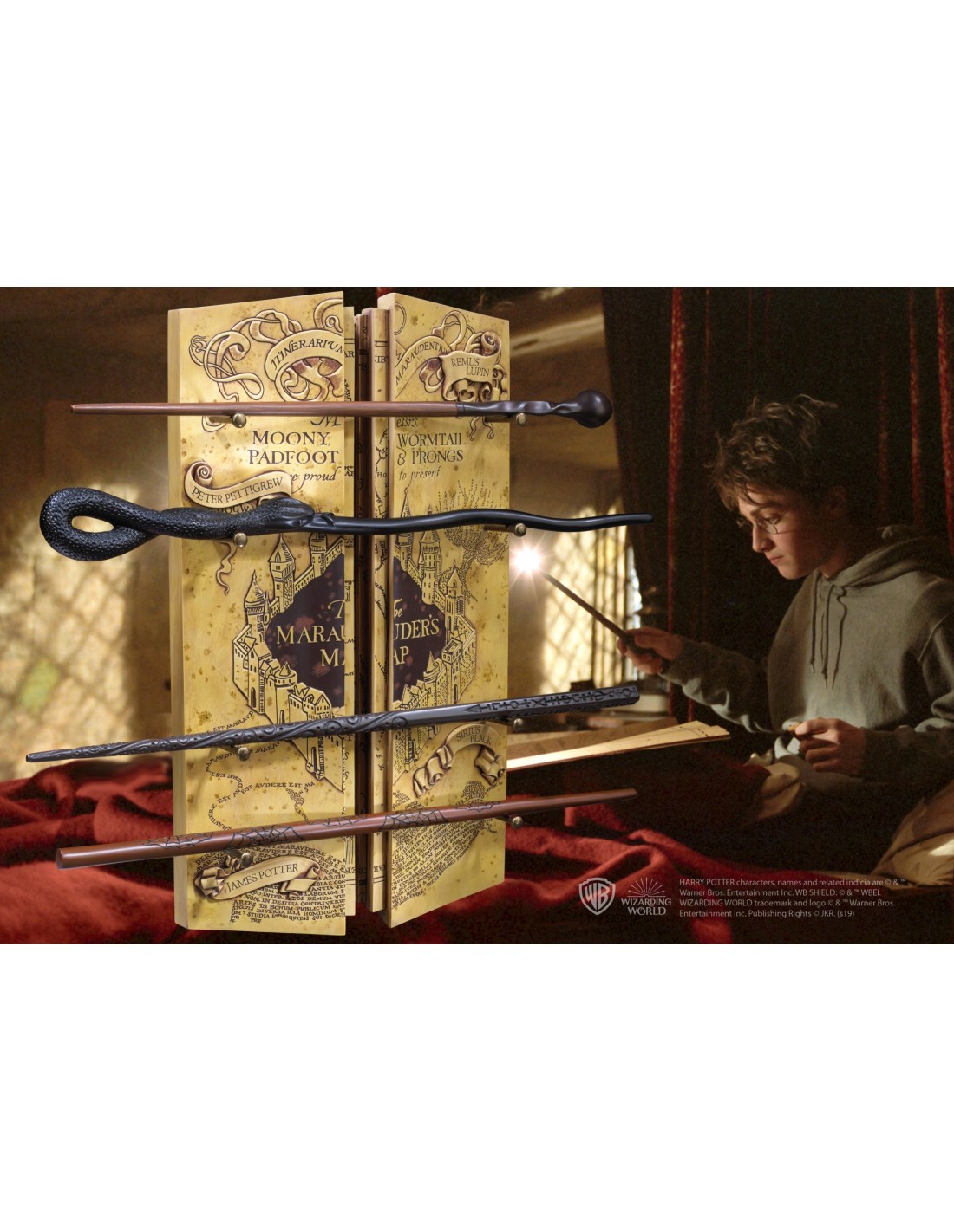 Las varitas de los cuatro Merodeadores, Remus Lupin, Peter Pettigrew (exclusivo), Sirius Black y James Potter, en un mapa de resina pintado a mano de los Merodeadores.