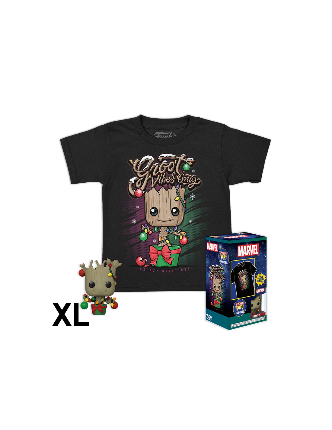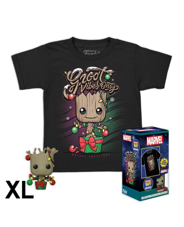 The XL shirt features a festive design with Groot wearing a Santa hat and surrounded by Christmas elements, while the Funko POP! figure shows Groot in a charming pose with a small POP! pocket in hand, perfect for adding a festive touch to your collection!