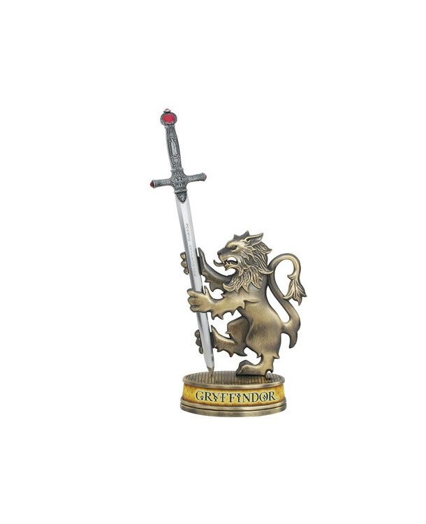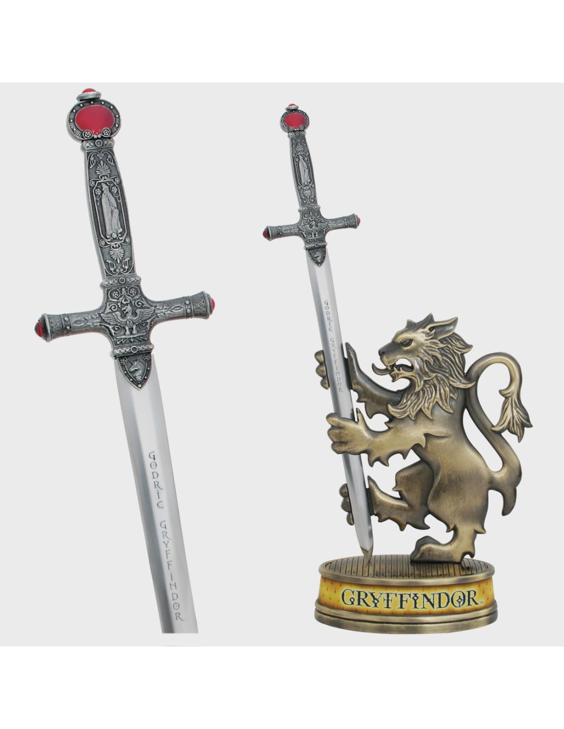 Empuñe la espada de Godric Gryffindor en formato miniatura con este exclusivo y detallado abrecartas, alojado dentro de un soporte de león de Gryffindor fundido a presión.
