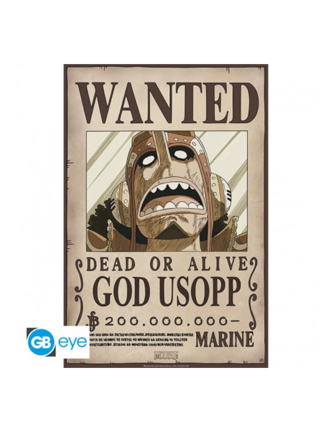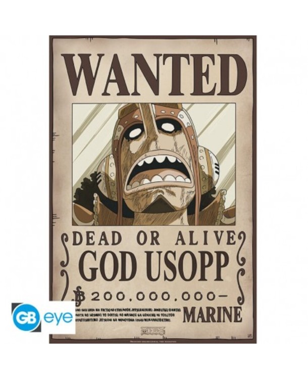 Siguiendo el estilo auténtico de los carteles "Wanted" de One Piece, este póster presenta un diseño que captura la esencia de la serie. La tipografía, los detalles del marco y la imagen de Usopp le otorgan autenticidad y un toque de humor.