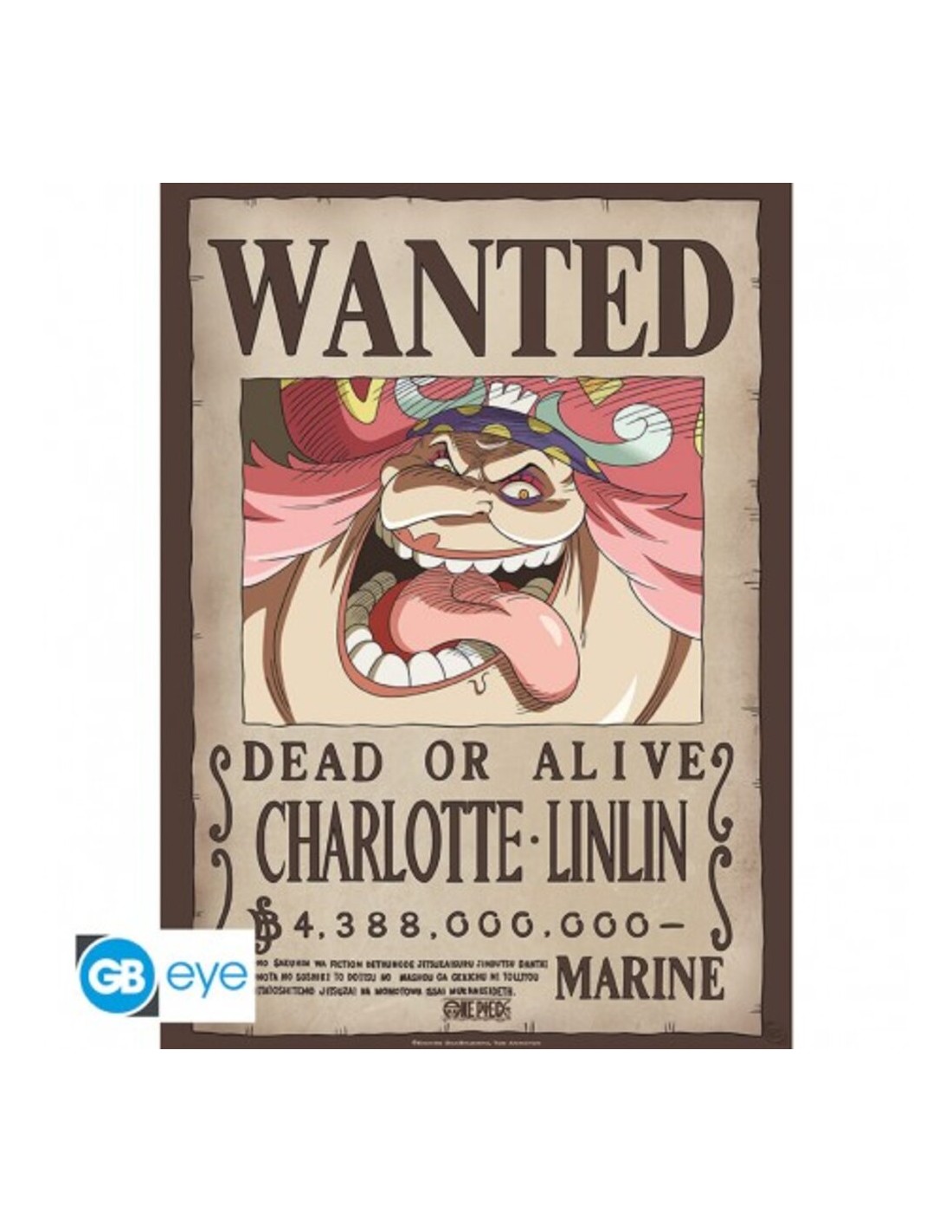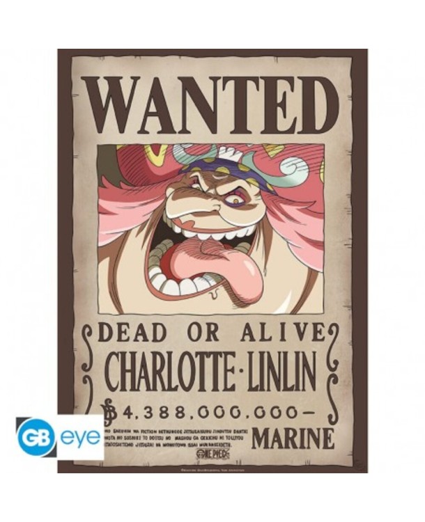 Cette affiche présente le style caractéristique des affiches de recherche de One Piece, avec une image détaillée de Charlotte Linlin, également connue sous le nom de Big Mom. Avec son regard défiant et son aura imposante, cette affiche est un ajout indispensable pour tout fan de la série.