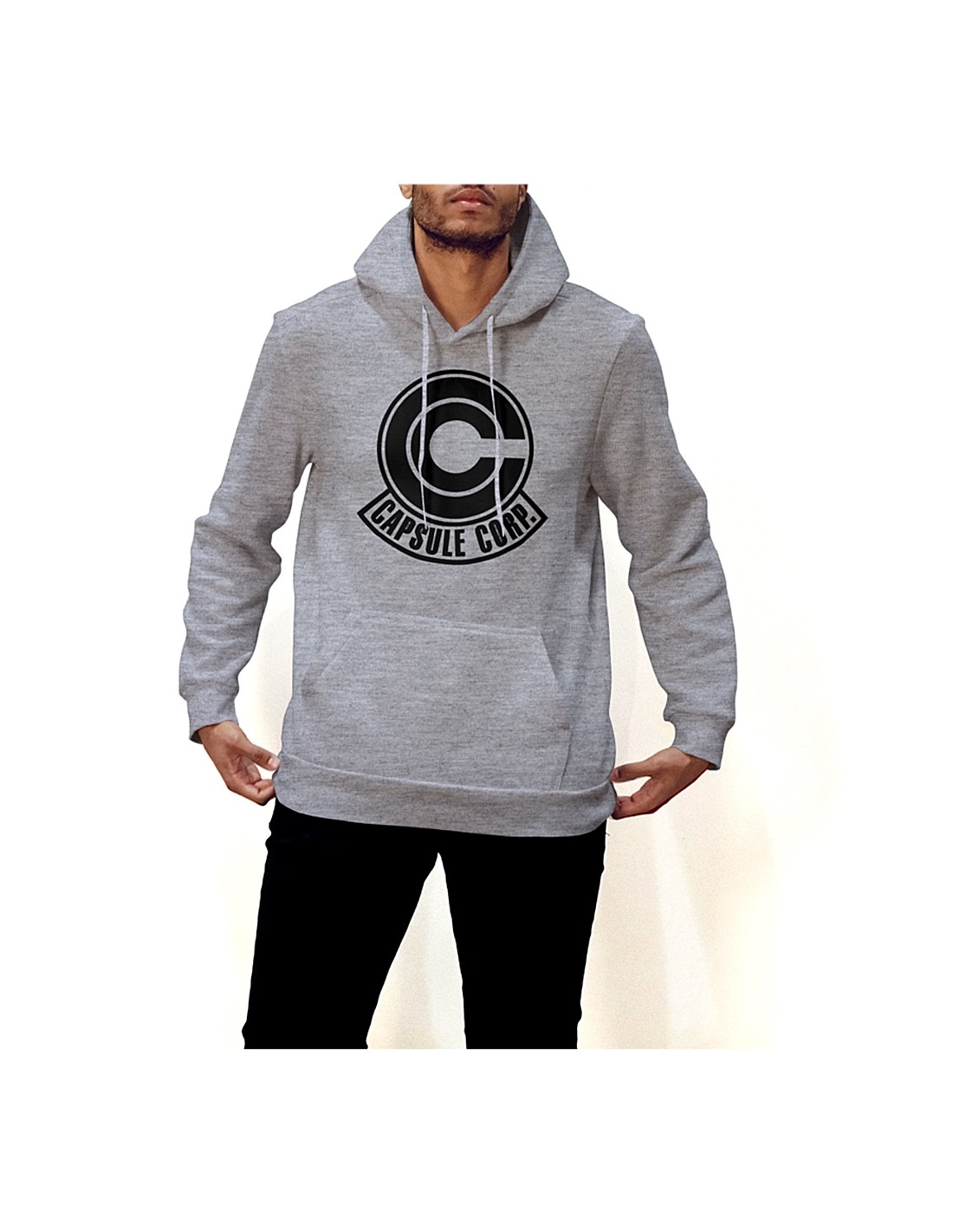 El diseño simple pero impactante de la sudadera en gris y negro resalta el icónico logo de la Capsule Corp. en el pecho. Esta simplicidad le da un toque de elegancia mientras muestra tu devoción a Dragon Ball.